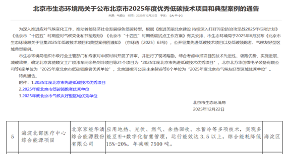 近日,北京市生态环境局公布了北京市2025年度优秀低碳技术项目和典型案例的评选结果,京能华清投资、建设并运营的“海淀北部医疗中心综合能源项目”荣膺其列。